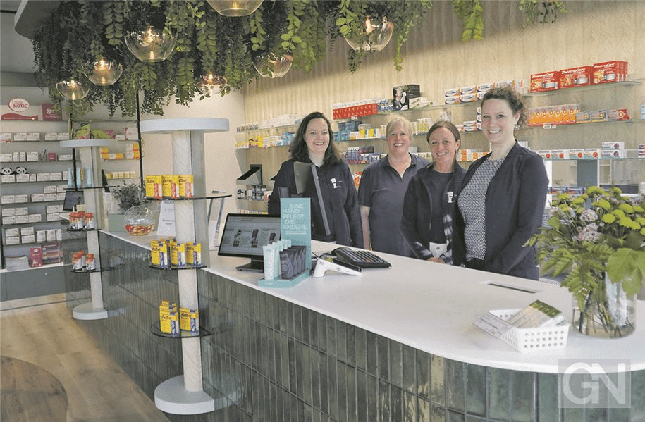 Die EUREGIO-Apotheke befindet sich im Erdgeschoss des Gebäudes. Betrieben wird sie von Karin Ammeling-Staat (rechts im Bild). Foto: Henrik Hille / GN